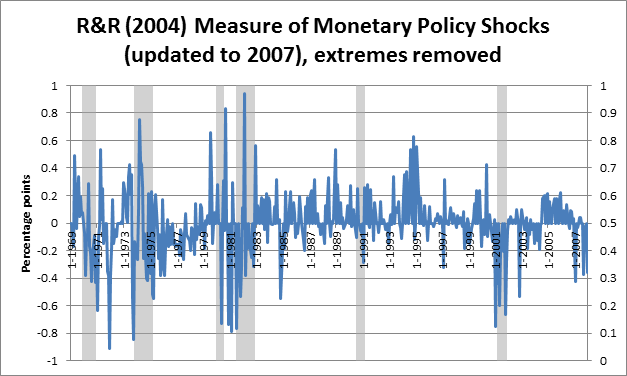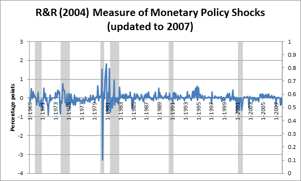 I've updated the Romer and Romer (2004) series of monetary policy shocks. The main takeaway is this graph of monetary policy shocks by month, since 1969, where the gray bars indicate recession: