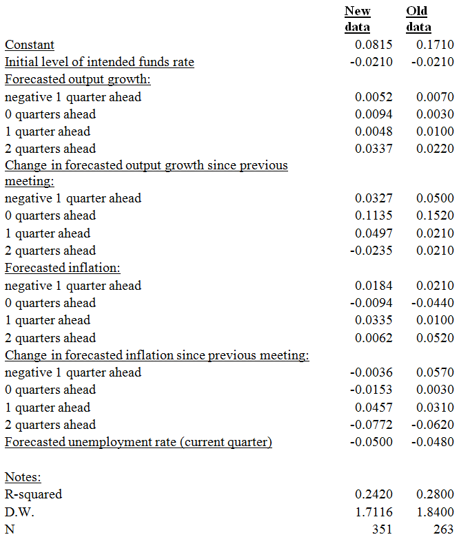 First, the Romers derive a series of intended changes in the federal funds rate. (This is easy starting in the 1990s, since the FOMC began announcing when it wanted to change the FFR; before that, the two had to trawl through meeting minutes to figure it out.) They then use the Fed's internal Greenbook forecasts of inflation and real growth to control the intended FFR series for monetary policy actions taken in response to information about future economic developments, specifically RGDP growth, inflation, and unemployment.